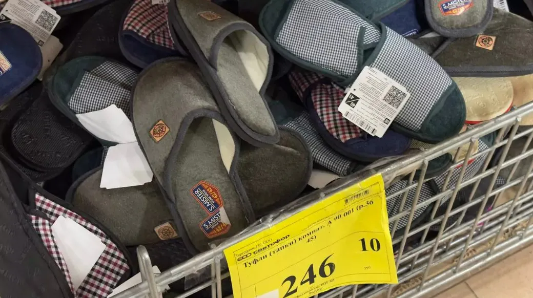 А ещё впервые заметила в «Светофоре» целую стену с обувью! Особенно много домашних тапок — разные фасоны, на твёрдой и мягкой подошве, по 249 рублей. Присмотрела себе пару с мехом внутри. Рядом лежали простые кроссовки за 634 рубля. Для спорта вряд ли, а для дачи или прогулки с собакой — вполне.