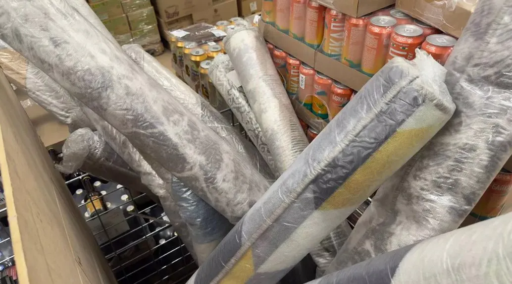 Сразу у входа обратила внимание на стойку с коврами. Лежат рулоны размером полтора на два метра, цена — 1535 рублей. Этикеток на образцах не было, поэтому разглядеть рисунок как следует не получилось, но на ощупь плотные, не самые тонкие. Подумала, что такой мог бы подойти в гостиную, если узор понравится.