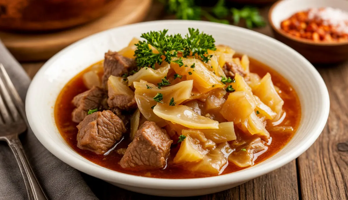 Сытность и вкус. Мясной соус пропитывает капусту, делая блюдо полноценным и ароматным.