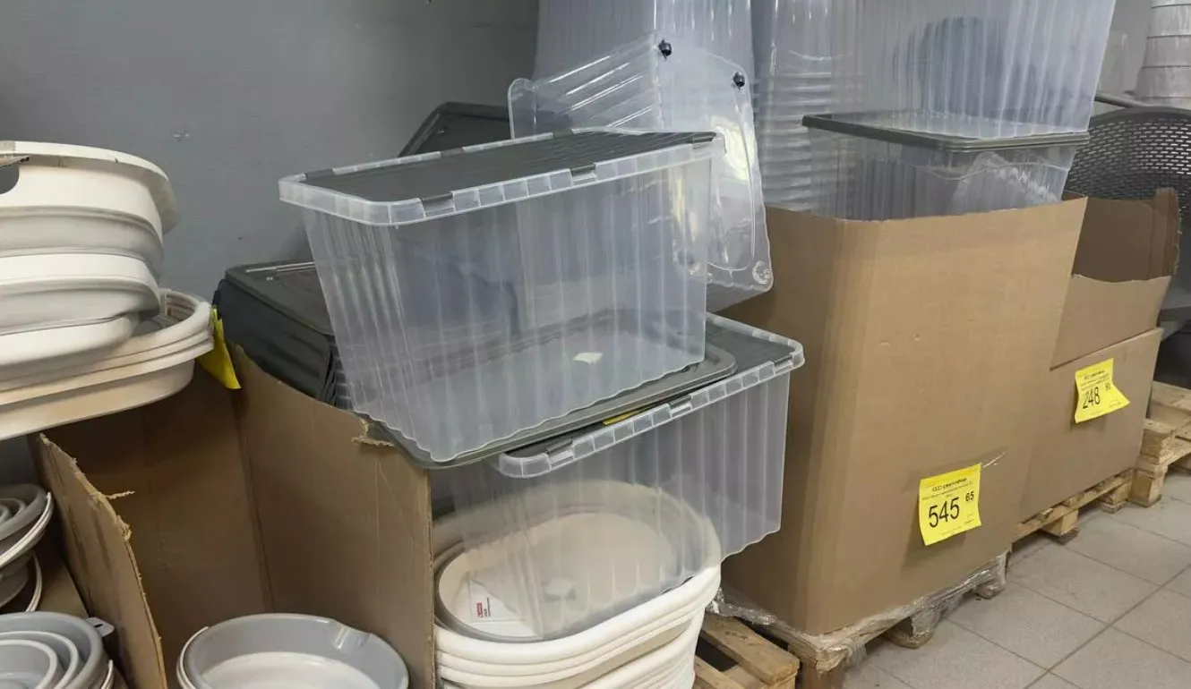 Хозяйственные мелочи: губки для посуды, прочные пластиковые ящики, вёдра и тазы.