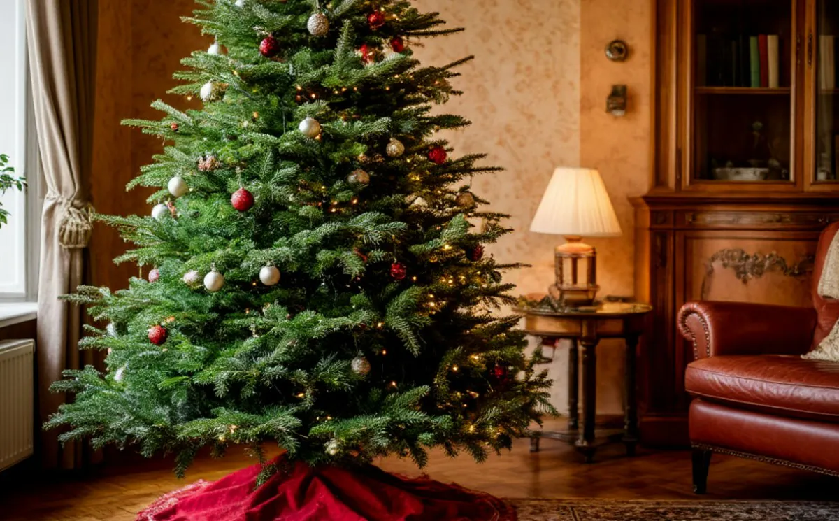 Ель обыкновенная — классический выбор с густым ароматом, но и самый хрупкий. Сохраняет вид около 10–14 дней, требует особенно тщательного ухода.