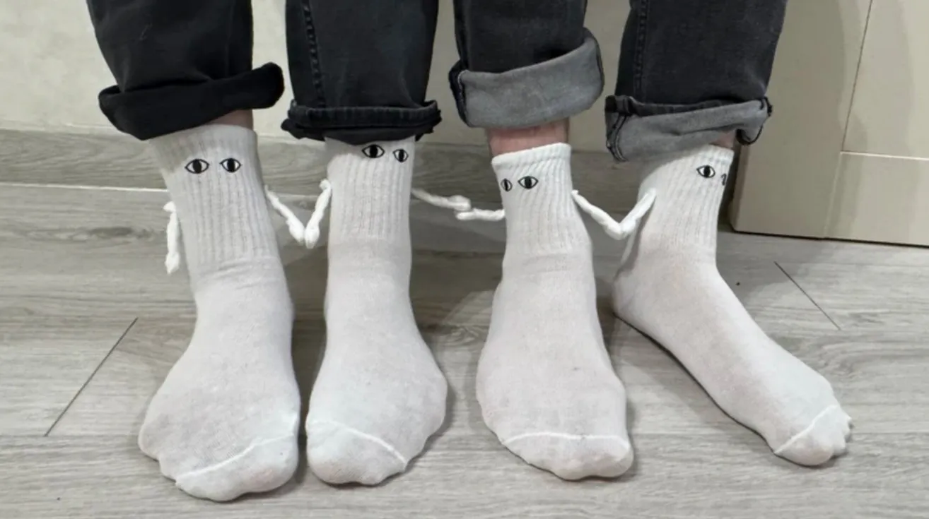 Первое — это парные носочки с магнитами. Очень милый подарок. Они сделаны из эластичного хлопка, подходят для размеров ноги от 37 до 43, а в комплекте идёт сразу две пары. Особенная деталь — забавные ручки на носках, которые могут соединяться магнитами. Артикул: 171474911