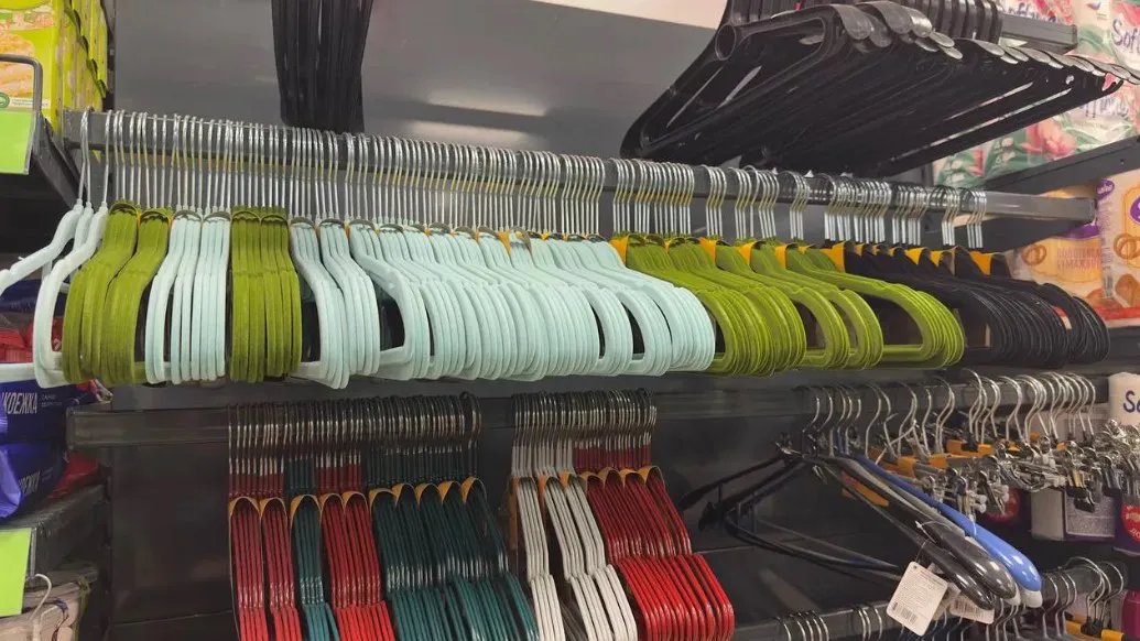 Для тех, кто ценит системность, нашлись приятные мелочи. На стойках развешаны бархатные вешалки. Они не только придают гардеробу единый, аккуратный вид, но и предотвращают соскальзывание блузок или платьев с тонких бретелей. На кухне внимание привлекают универсальные силиконовые коврики. Их можно использовать и как подставку под горячее, и как сушилку для посуды, и как основу для разделочной доски, чтобы та не скользила по столу. Такая многофункциональность за копеечную цену — типичная находка для этого магазина.