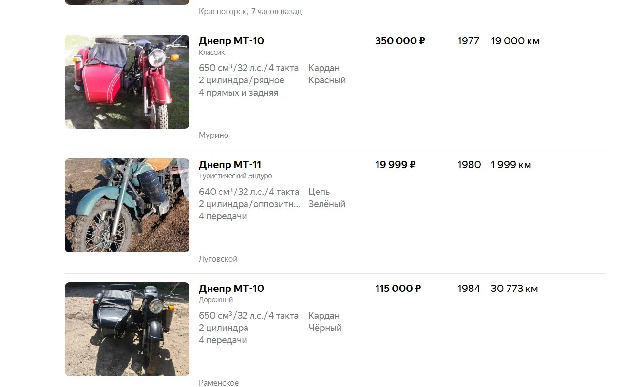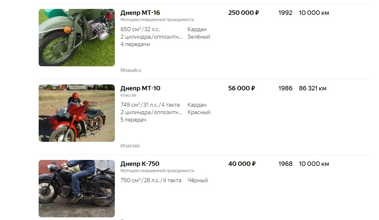 Самым дорогим оказался тяжёлый мотоцикл «Днепр» с люлькой. Его цена доходила до 1400–1900 рублей. Его главный конкурент «Урал» стоил 1200–1500 рублей. Разница небольшая, но она была.