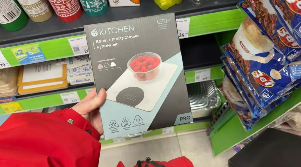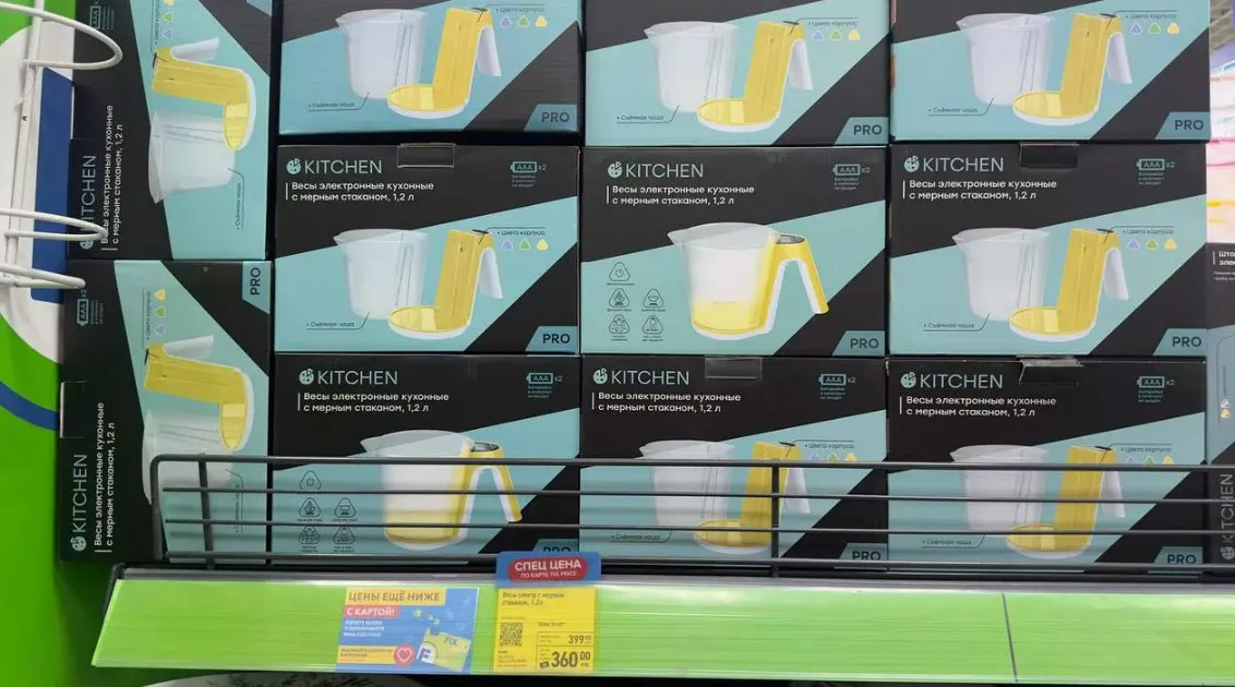 Рядом была другая версия — с мерным стаканом на 1,2 литра за 360 рублей по карте. Весы и стакан — одна система. Налил воду, насыпал муку, всё сразу видно на табло. Не нужно мыть лишнюю посуду и переливать из одной ёмкости в другую. Для выпечки и точных рецептов вещь незаменимая.