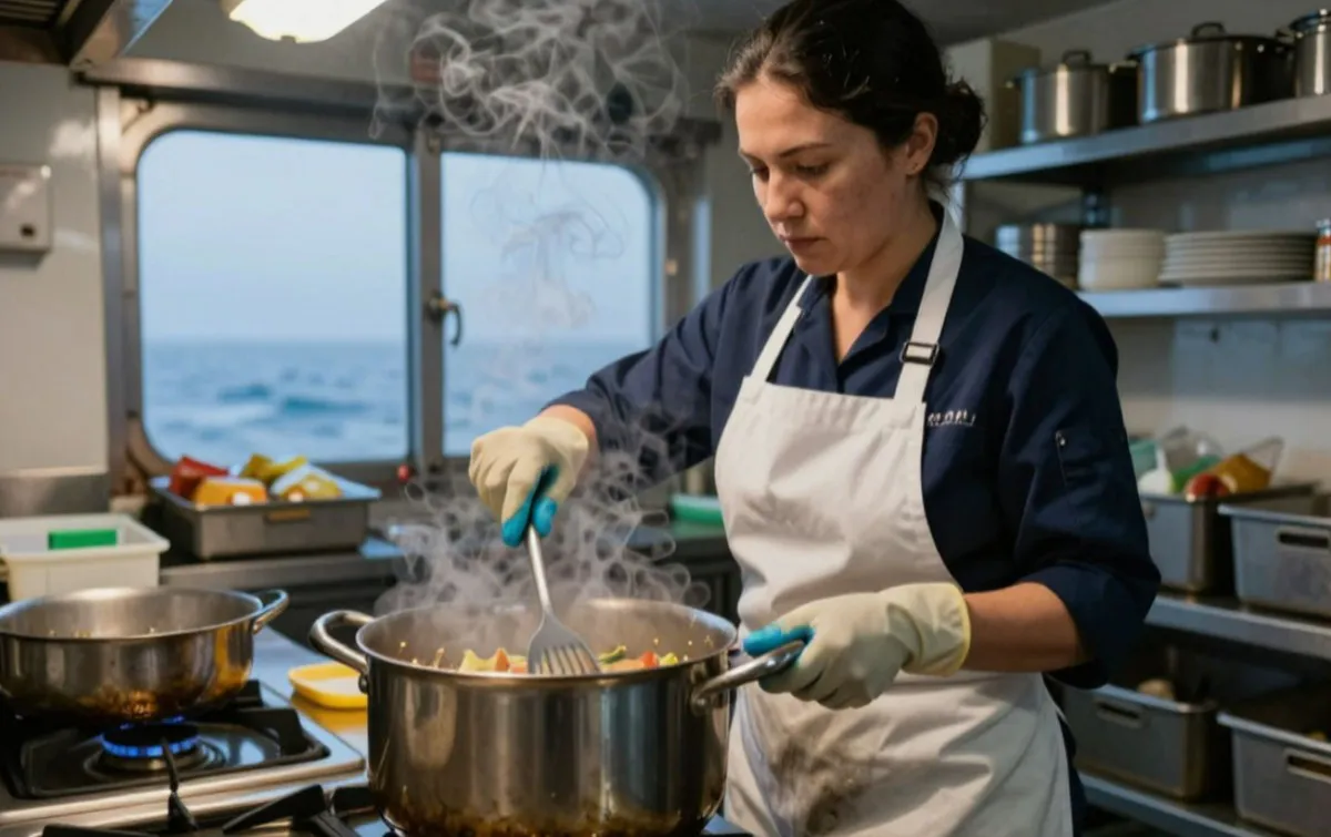 Работа повара на корабле требует огромной выдержки. Готовить 3 раза в день для 20 мужчин нужно в любую погоду. В шторм посуда летает, кастрюли падают, но завтрак должен быть вовремя. Запасы ограничены тем, что взяли в порту, — меню нужно планировать на месяц вперед.