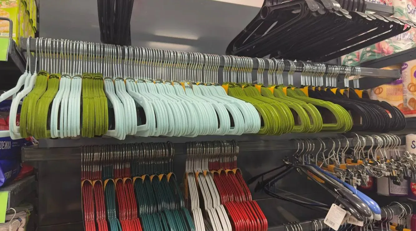 Тут же рядом висели бархатные плечики. Вещи на них не скользят, а в шкафу сразу появляется порядок, даже если просто повесить всё на одинаковые вешалки.