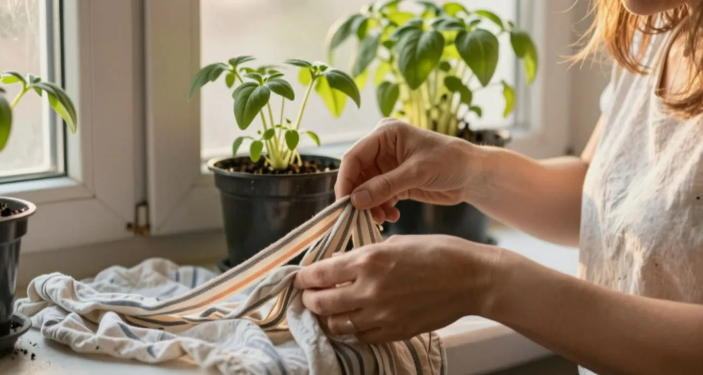 Из узких полос простыни можно сделать мягкие подвязки для растений на балконе или даче. Они бережно фиксируют стебли и не пережимают их, в отличие от жёсткой верёвки.