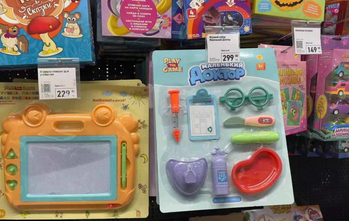 Среди игрушек для сюжетных игр нашёлся набор для доктора. В коробке — всё, как у настоящего врача: шприц без иглы, термометр, бинт и другие инструменты. Такая игра не только увлекает, но и учит заботиться о других, а заодно знакомит с профессией.