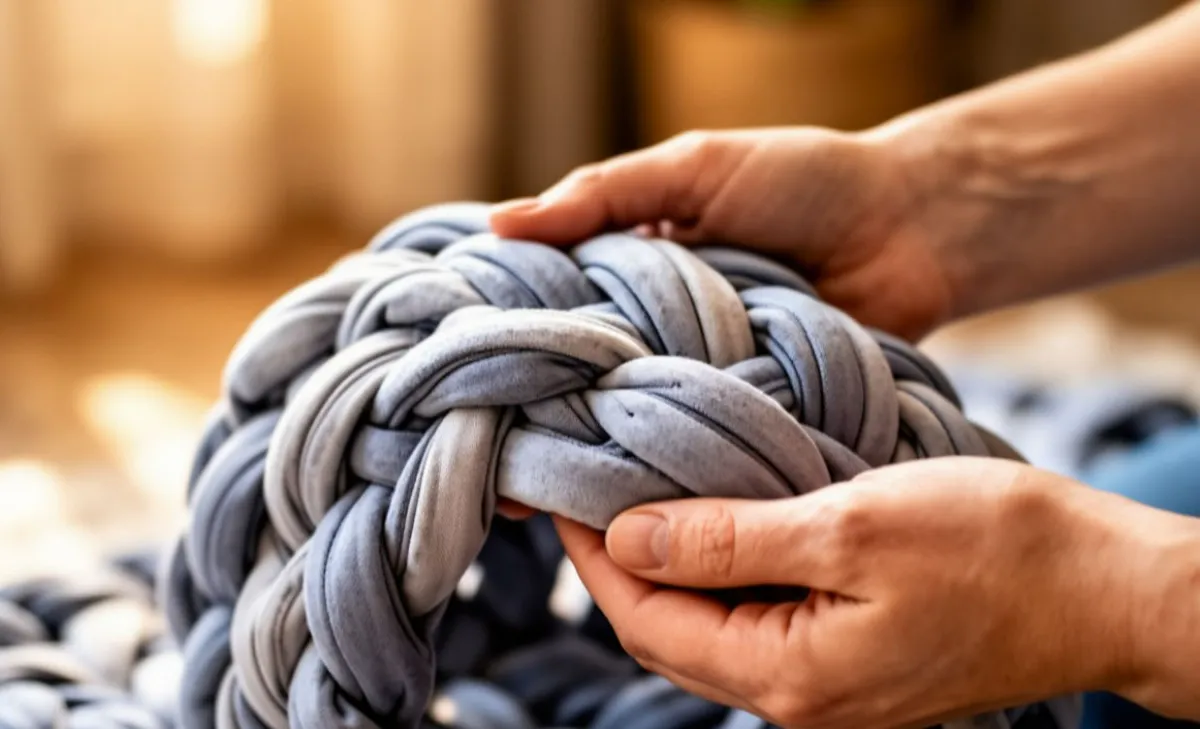 Джинса — вариант посложнее: ткань жёсткая, края могут сыпаться, но в итоге выходит очень прочный, фактурный коврик. Его можно смело стелить в прихожей или на даче — выдержит всё. А из старых вязаных свитеров (кашемировых или акриловых) получается мягкая, пушистая нить. Такой коврик будет почти как плед — тёплый и уютный.