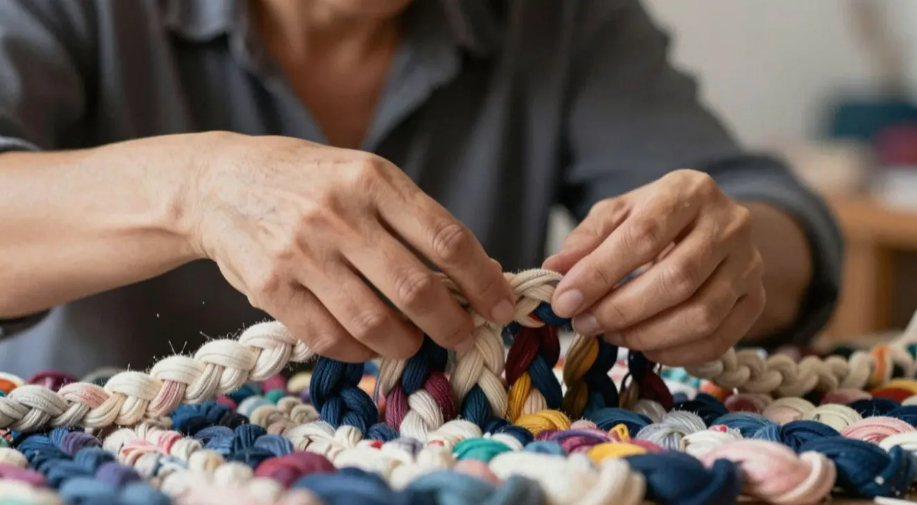 Для плетения коврика лучше всего брать трикотажные вещи — старые футболки или лонгсливы. Они тянутся, края не осыпаются, а косичка получается плотной и упругой. Хорошо подходит и постельное бельё, которое уже отслужило своё. Бязь и сатин не такие эластичные, зато отлично держат форму.